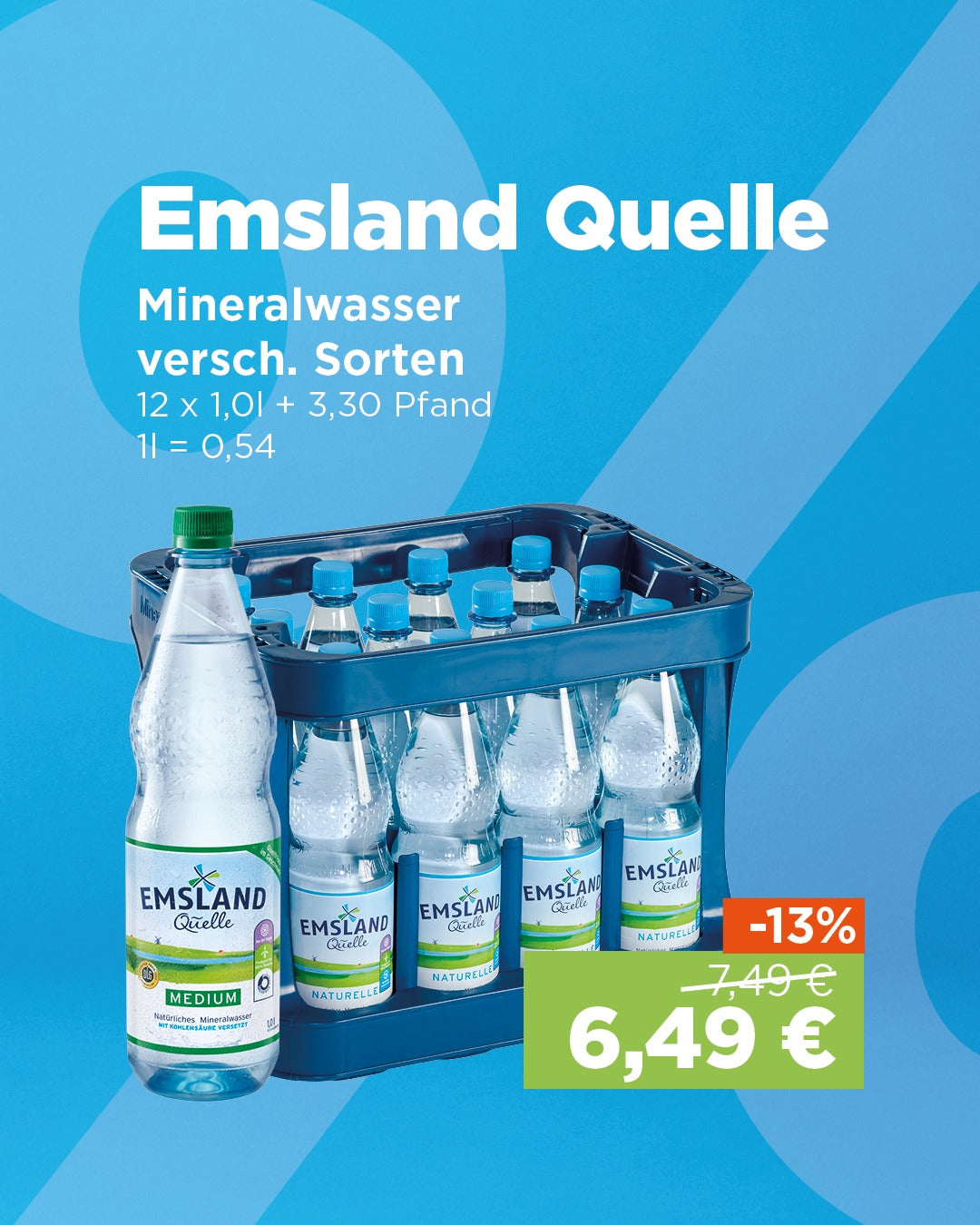 Preis: 7,49 €Angebotspreis: 6,49 €zzgl. 3,30 € PfandGrundpreis: € 0,54pro lEmsland Quelle Medium ist ein hochwertiges Mineralwasser, das reichhaltige Mineralien und Spurenelemente von natürlicher, ursprünglicher Reinheit m...